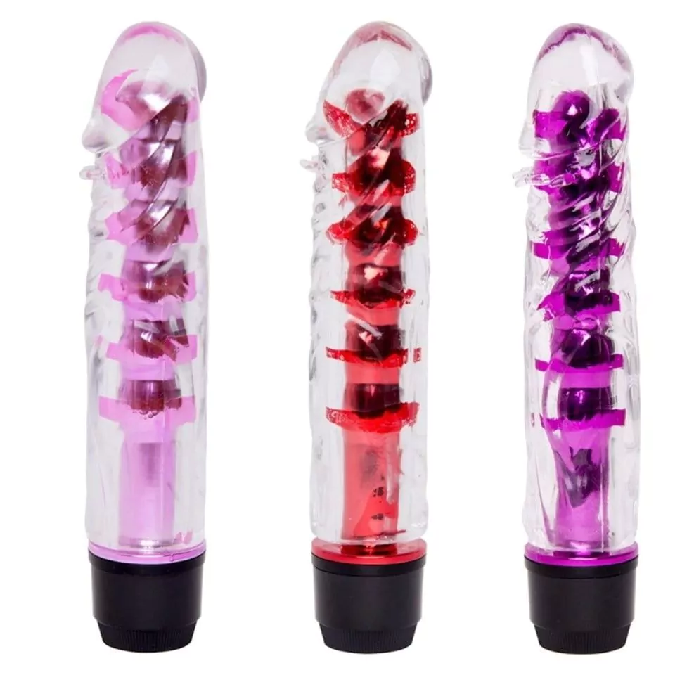 Vibrador translúcido, possui em seu relevo nódulos massageadores, possibilita o uso sem a capa, podendo utilizar como capa peniana. Sem a capa pode ser usado para estimulação anal.